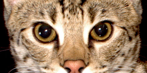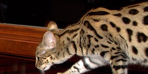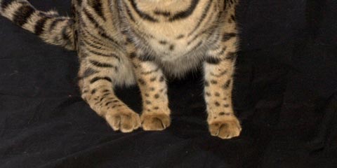 Don't be fooled, Spots are important! Look for Very crisp and bold spots. The markings should be well defined and look very similar if not identical to a Serval. The legs will have smaller spots or ticking on them. Look for it. Black, brown spotted tabby, silver spotted tabby, black smoke ONLY. The only color variations allowed are the gold to orange ground color with bold dark markings, the silver ground color with bold dark markings, solid black and black smoke. In any variation the lips are black, as are the prominent black tear duct lines on the inner sides of each eye.